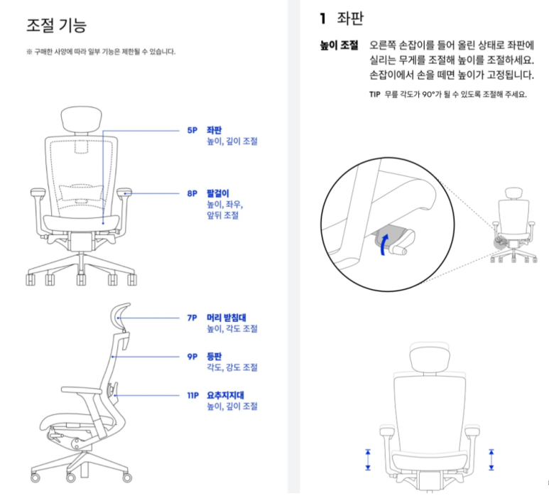 엄청나게 많은 부분이 조정이 됩니다. 몸이 닿는 거의 부위가 조정이 가능하게 되어 있네요