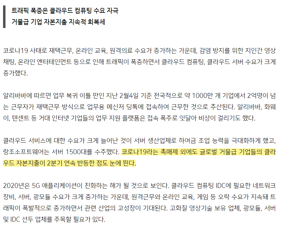 춘제 직후 중국인 2억명 재택근무코로나19로 클라우드 수요 폭증코로나19 확산으로 인한 방역 통제에도 조...