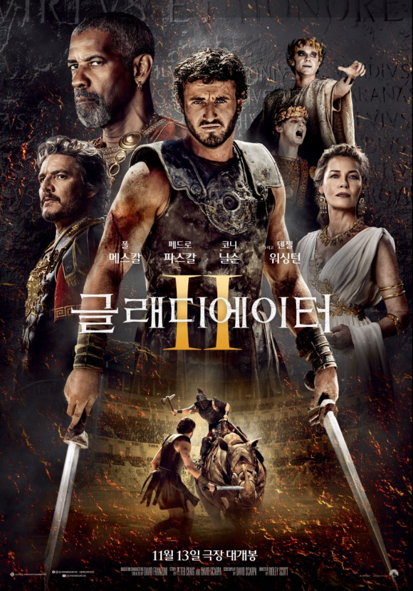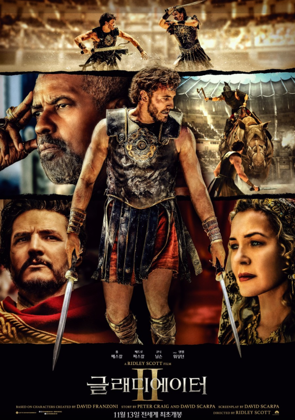 전편을 흉내내면서 유혈낭자한 검투와 주둔지의 모습은 더 증폭시킨, <글래디에이터 II>는 덴젤 워싱턴의 신 스틸러와도 같은 연기로부터 많은 힘과 명예를 얻은 화려한 액션쇼다.
