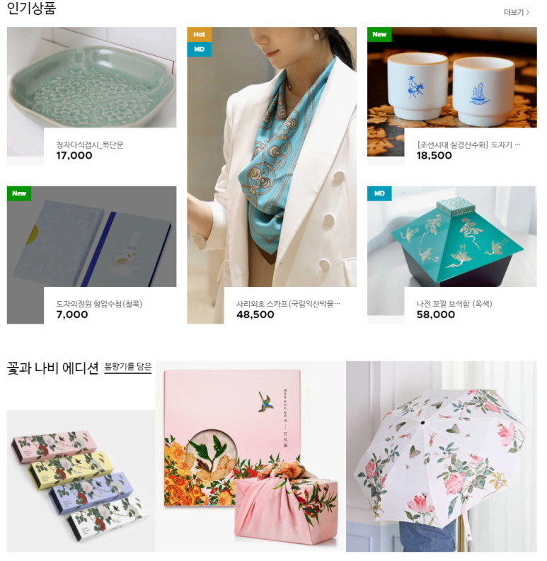 인기상품 청자다식접시_목단문 17,000 도자의정원 형압수첩(철쭉) 7,000 사리외호 스카프(국립익산박물관 특화상품) 48,500 [조선시대 실경산수화] 도자기 잔세트 18,500 나전 꼬깔 보석함 (옥색) 58,000