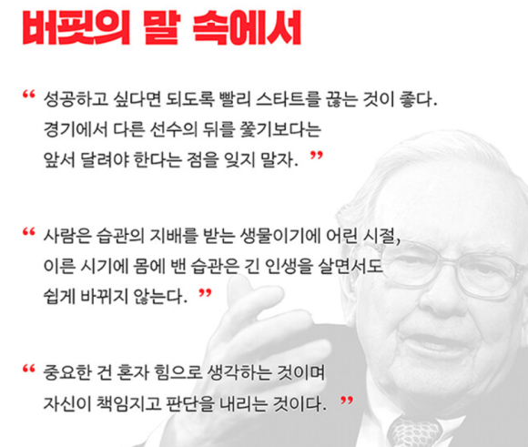 이 책에 담긴 말들은 세계 최고 투자자의 명언이지만, 놀랍게도 정작 그 메시지는 ‘돈을 버는 법’이 아니라 ‘삶을 살아가는 태도’에 맞춰져 있다. 버핏은 자신의 원칙을 투자뿐만 아니라, 삶에 있어서도 적용했던 것이었다. “일단 시작하지 않으면 절대 성공할 수 없습니다”, “실패한 방법을 굳이 반복할 필요는 없습니다” 등 버핏의 원칙이 담긴 한 문장 한 문장을 읽어가다 보면 그가 어떤 마음으로 세상을 살아갔는지 뼛속 깊이 느낄 수 있을 것이다.