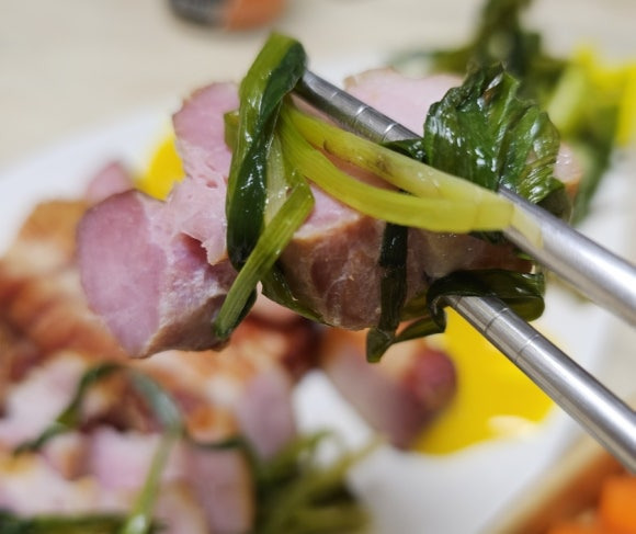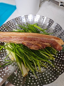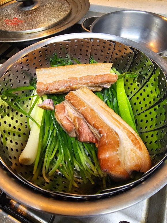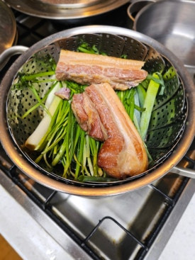 대파깔고 부추 얹어서 그위에다 고기를 살짝 쪄줍니다.