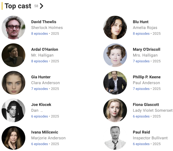 US Air Date: April 16, 2025 Starring: David Thewlis, Blu Hunt, Dougray Scott Network: The CW Synopsis: The mystery thriller series SHERLOCK & DAUGHTER puts Sherlock Holmes (David Thewlis, “The Artful Dodger,” “Fargo”) out of his comfort zone, mysteriously unable to investigate a sinister case without risking the lives of his closest friends. Enter: young American Amelia (Blu Hunt, “The Originals,” “The New Mutants”). After her mother’s mysterious murder, she learns that her missing father may be the legendary detective. Despite wildly different backgrounds and attitudes, the pair must work together to solve a global conspiracy, crack her mother’s murder, and find out for sure if she really is Sherlock’s daughter.