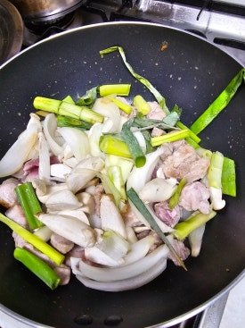 - 고기 볶기 냄비에 식용유를 두르고 돼지고기를 볶다가 감자, 양파, 애호박을 넣고 양념장을 부어 잘 섞습니다.