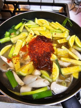 이 찌개의 핵심은 돼지고기 고추장 애호박입니다.