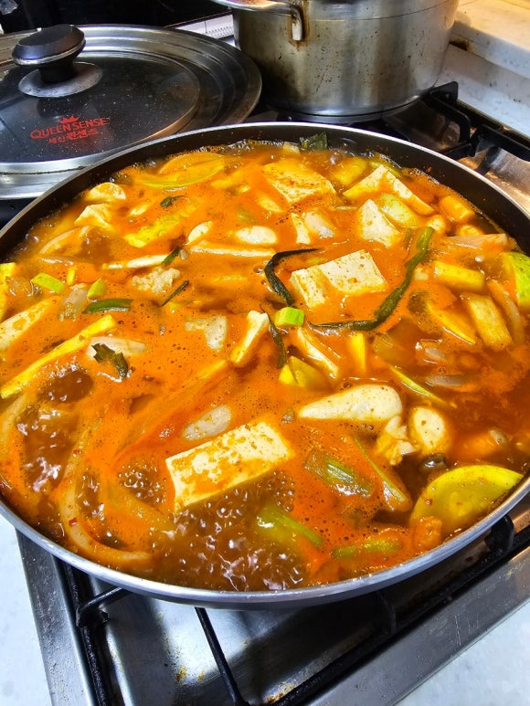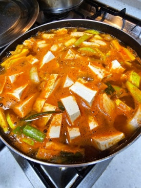 - 찌개 끓이기 준비한 육수를 붓고 끓이다가 두부, 고추를 넣고 한소끔 더 끓이면 완성!