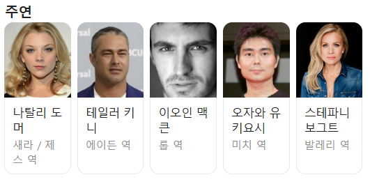 주연: 나탈리 도머(사라/제스), 테일러 키니(에이든), 오자와 유키요시(미치)