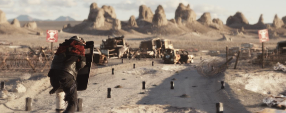 황폐한 서부 사막 풍경을 배경으로, 고전 웨스턴과 매드맥스풍 디스토피아가 결합된 비주얼.
