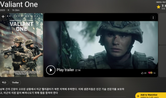 《발리언트 원 (Valiant One, 2025)》은 2025년 1월 31일 미국에서 개봉한 밀리터리 액션 스릴러 영화예요. 긴장감 넘치는 설정과 생존 드라마가 결합된 작품으로, 한반도의 군사적 긴장 속에서 벌어지는 이야기를 다룹니다