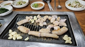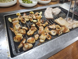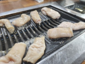 뭉근하게 철판에 굽는거라 너무 건드려 기름이 떨어지게 하는것 보다 그냥 두는 게 좋습니다.