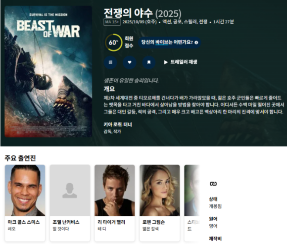 CGI뿐 아니라 실제 특수효과를 적극 사용해 긴장감을 극대화했습니다.인간의 잔혹한 전쟁과 자연의 무자비한 포식자가 겹쳐지며, "진짜 야수는 누구인가?"라는 질문을 던집니다. 2차세계대전에서는 인류가 인류사에서 아마 제일 잔혹했던 시기였던것 같은 데 그런 인류전쟁에 참전한 듯한 상어대표님