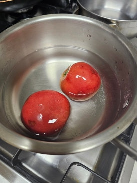 토마토는 데쳐서 껍질을 벗기고 웨지 모양으로 자릅니다.
