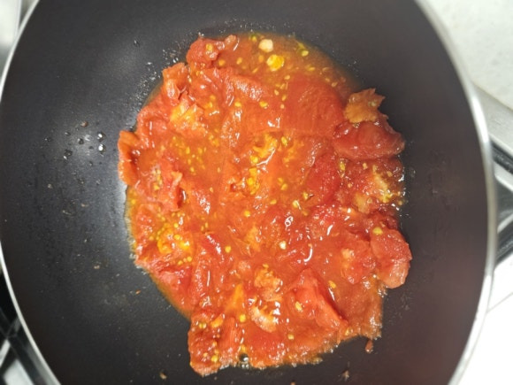 팬에 달걀을 스크램블로 익힌 후 따로 두고, 마늘, 파, 양파를 볶다가 토마토와 양념을 넣어 볶습니다.