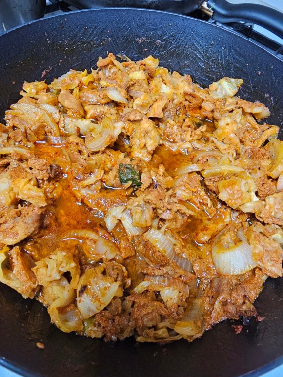 미리 마른 상태에서 기름으로만 볶아서 어느정도 고기가 여기저기