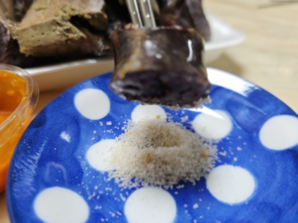 어떤 집은 소금에 다진 마늘이나 후추를 살짝 섞어 풍미를 더하기도 해요. 깔끔하고 담백하게 먹는 걸 선호하는 경상도 사람들의 입맛이 잘 드러나죠.