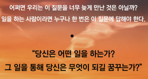끊임없이 노력하는 자세와 일자체에서 보람과 인생의 여정,행복을 느끼라 하는 데 현시대는 많이 다르긴 합니다.