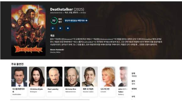 데스스토커(2025)는 원작의 매력을 계승하면서도 현대적 특수효과와 유머를 더해 새롭게 탄생한 판타지 액션 영화입니다. 고전적인 검과 마법의 세계를 좋아하는 관객뿐 아니라, 장르적 유머와 실험적 연출을 즐기는 관객에게도 좋겠지만
