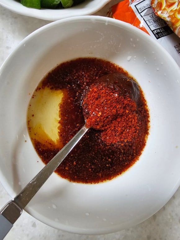 라면스프반에 간장1 고추가루1 고추장1 올리고당2 정도에