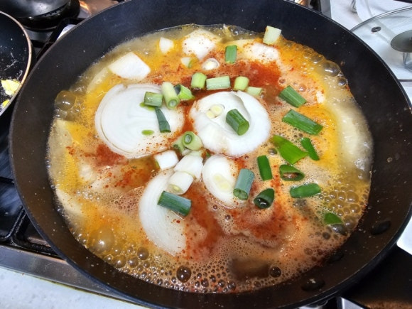 5분정도 끓이다 양파랑 대파를 넣어줘요