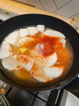 무깔아줍니다. 물 500cc 들어갈건데 무는 자박하게 무가 잠길정도로 넣으세요