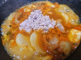 그럼 참치 한캔 넣고 조금만 더 끓이면 끝입니다.