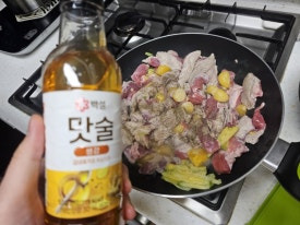 맛술조금 넣고 고기가 다 색이 변할 때까지 익혀줍니다.