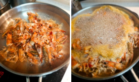 소금을 깔면 새우에서 나온 기름과 물이 팬에 직접 닿지 않아 프라이팬이 덜 더러워지고 눌어붙지 않음.