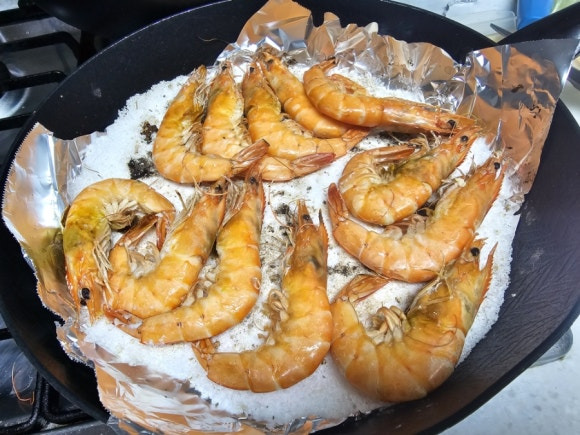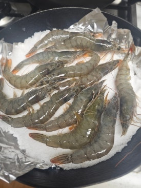 소금은 녹는점이 약 800도로 매우 높습니다. 팬 위에 소금을 깔면 소금이 뜨겁게 달궈져 열을 고르게 전달해 새우의 겉과 속을 균일하게 익힐 수 있습니다.