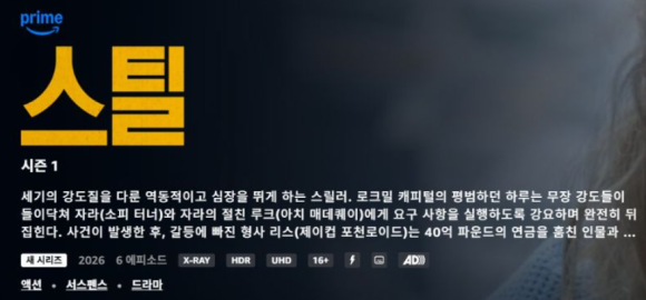 《스틸》(Steal)은 2026년 1월 21일 아마존 프라임 비디오에서 첫 방송된 영국의 하이옥탄 범죄 스릴러 시리즈입니다. 소피 터너, 아치 마데크웨, 제이콥 포춘-로이드가 출연하며, 소티리스 니키아스가 제작했습니다. 총 6부작 드라마로, 평범한 사무직 직원(터너)이 거대한 연금 기금 강도 사건에 휘말리게 되는 이야기를 그립니다.