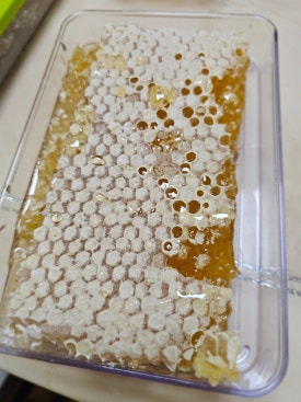 벌집 속 밀랍은 소화가 잘 되지 않으므로 많이 먹으면 속이 더부룩할 수 있습니다. 이건 씹다 버리세요