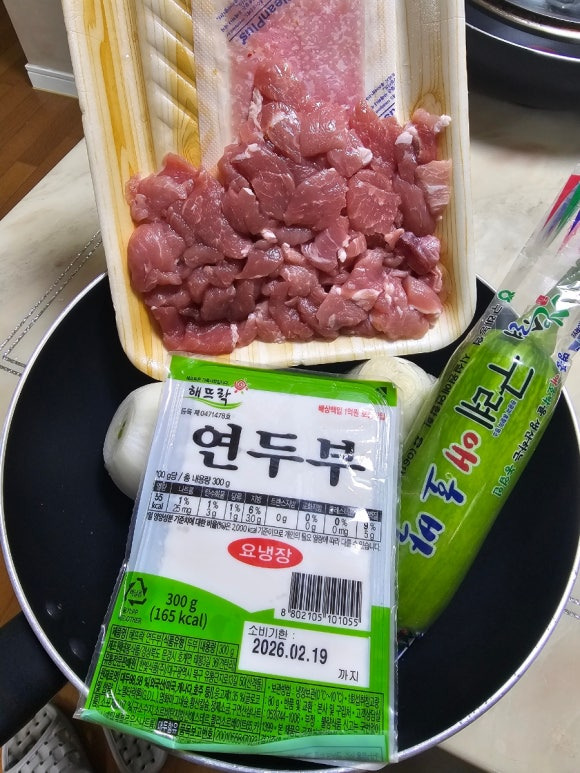 국거리용 고기와 애호박 양파 두부로 대충 퉁쳐봅니다.