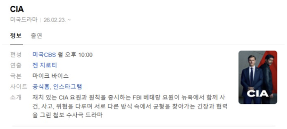 CBS 신작 드라마 CIA (2026)은 FBI 시리즈의 스핀오프로, 뉴욕을 배경으로 FBI와 CIA가 합동 태스크포스를 꾸려 국제 테러와 음모를 수사하는 첩보·범죄 액션물입니다. 2026년 2월 23일 첫 방송을 시작했으며, 딕 울프 제작진이 참여해 ‘법과 원칙을 중시하는 FBI’와 ‘규칙을 깨는 CIA’의 충돌을 핵심 재미로 삼고 있습니다.